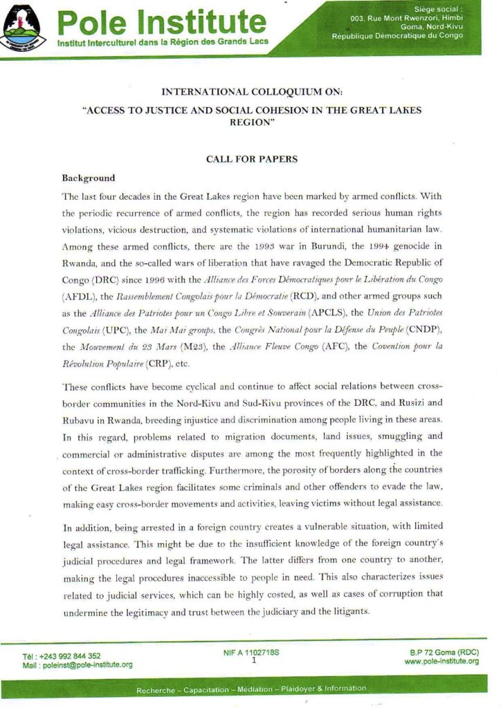 Call for papers – International colloquium on : ACCESS TO JUSTICE AND SOCIAL COHESION IN THE GREAT LAKES REGIONS